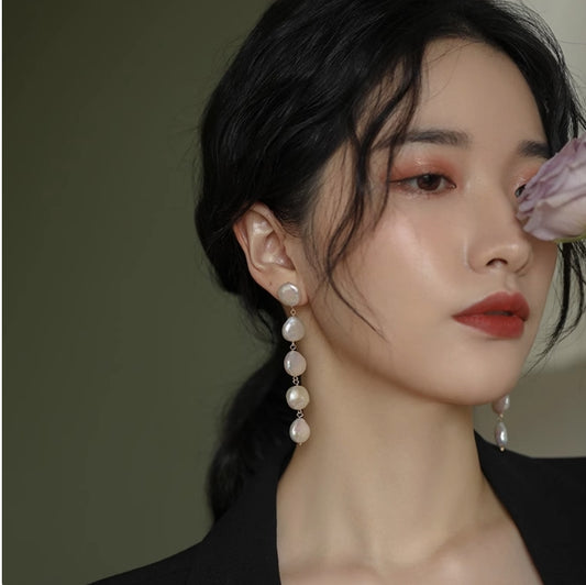 Baroque Freshwater Button Pearl Long Tassel Earrings