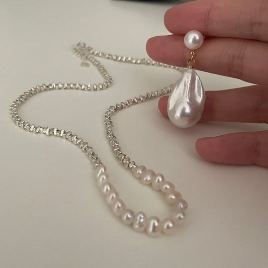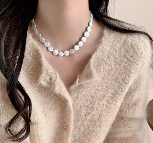Broken silver flat bead Pearl necklace